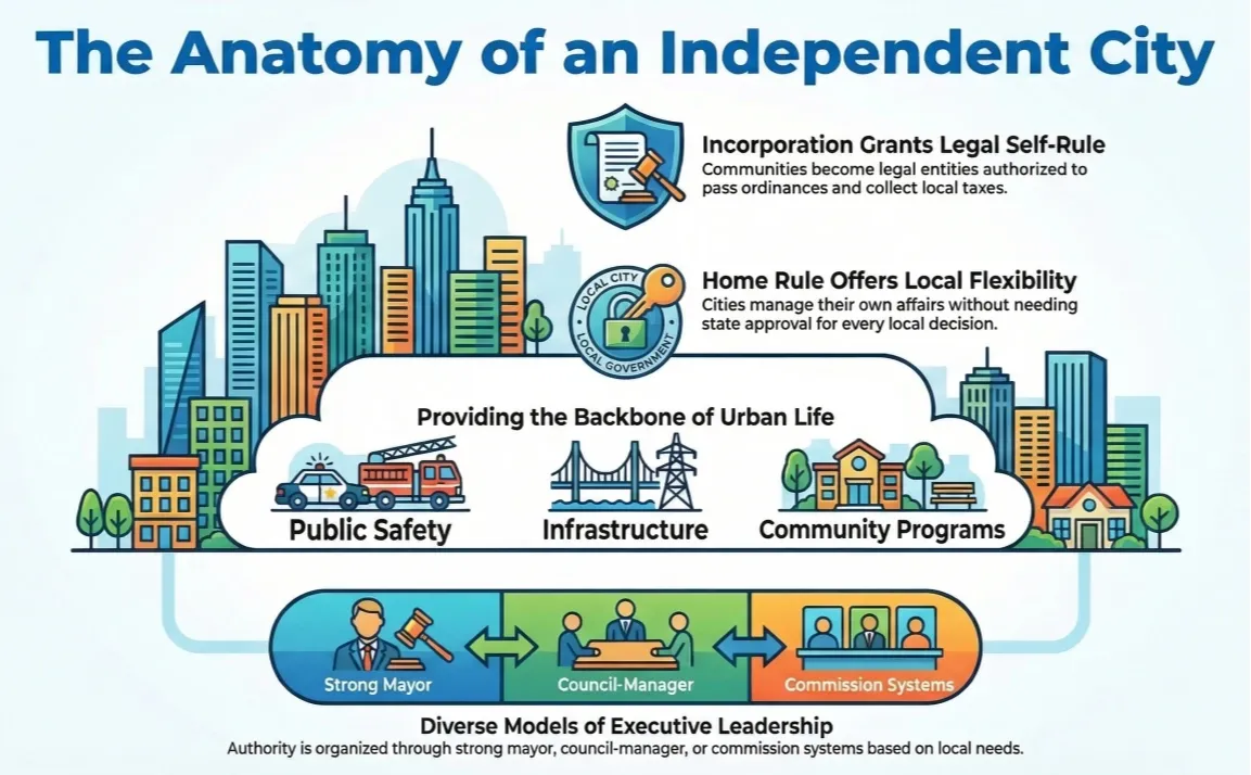 Once incorporated, a city has what is called municipal home rule in many states, meaning it has broad authority to manage its own affairs without needing state approval for every decision.